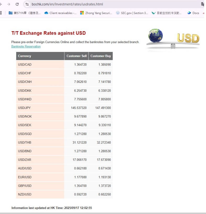2025年9月17日本週換匯匯率
