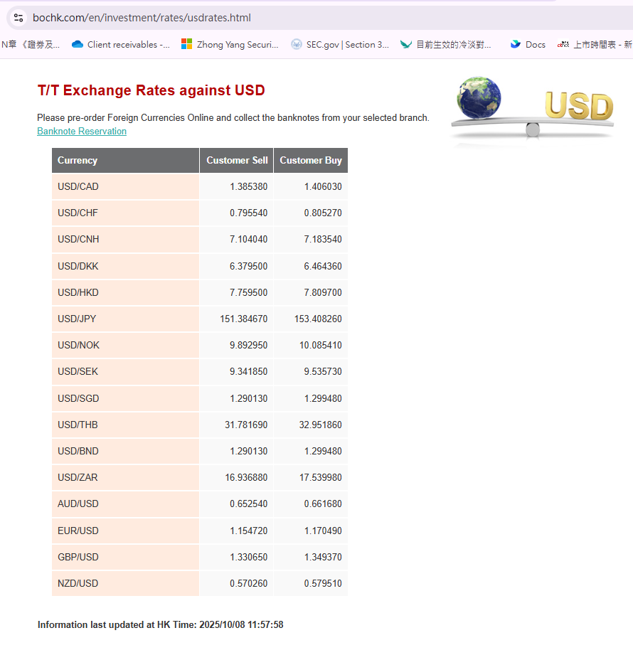 2025年10月8日本週換匯匯率